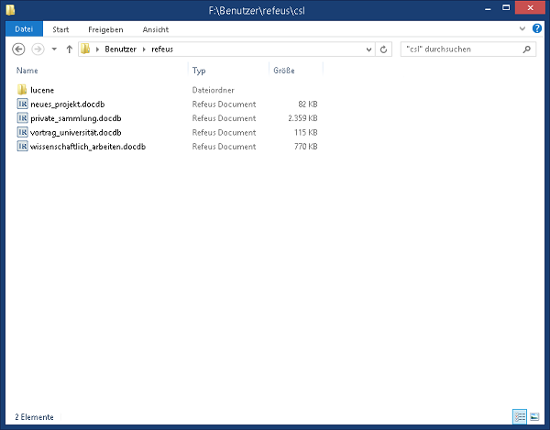 Refeus speichert Ihren gesamten Wissensbestand im Refeus-Verzeichnis in Form einer Datei im DOCDB-Format. Diese enthält alle Informationen (mit Ausnahme von Bild-Dateien) und kann somit einfach kopiert oder verschoben werden - z.B. auf einen anderen Datenträger oder zum Versenden per E-Mail. Wenn Ihr Wissensbestand Bilder enthält, befinden diese sich in Ihren Eigenen Dateien. Diesen müssen Sie in diesem Fall ebenfalls kopieren bzw. verschieben.