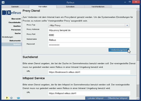 Je nach Einrichtung oder Internetzugang ist es möglich dass ein Proxyserver eingerichtet werden muss. Um eine Verbindung mit dem Internet und damit einigen Funktionen von Refeus herstellen zu können, müssen Sie gegebenenfalls eine Verbindung über einen Proxy-Server herstellen. Wählen Sie dazu den Button Einstellungen in der unteren linken Ecke. Unter Proxy Dienst können Sie die dazugehörigen Einstellungen hres Proxy-Servers vornehmen. Mit einem Klick auf Verbindungstest können Sie die Einstellung testen. Sollten Ihnen die Einstellungen Ihres Proxy-Servers nicht vorliegen, wenden Sie sich an Ihren System-Administrator.