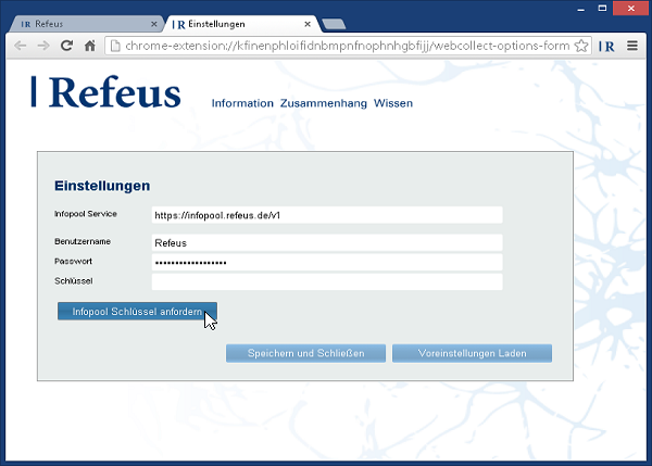 - Klicken Sie auf das Icon Refeus WebCollect im Browser und wählen Sie Einstellungen.