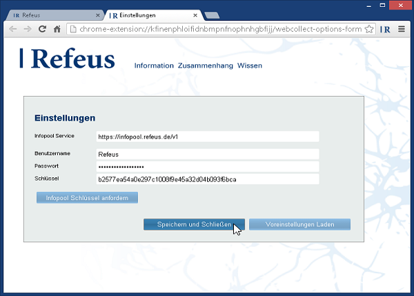 - Drücken Sie Speichern und Schließen: Refeus WebCollect ist nun konfiguriert.